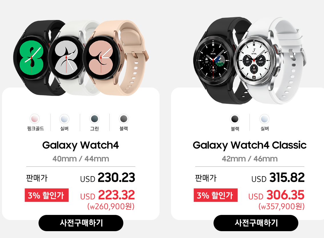 갤럭시 워치4 가격은 블루투스 44mm 모델이 29만9천원, 40mm 모델이 26만9천원