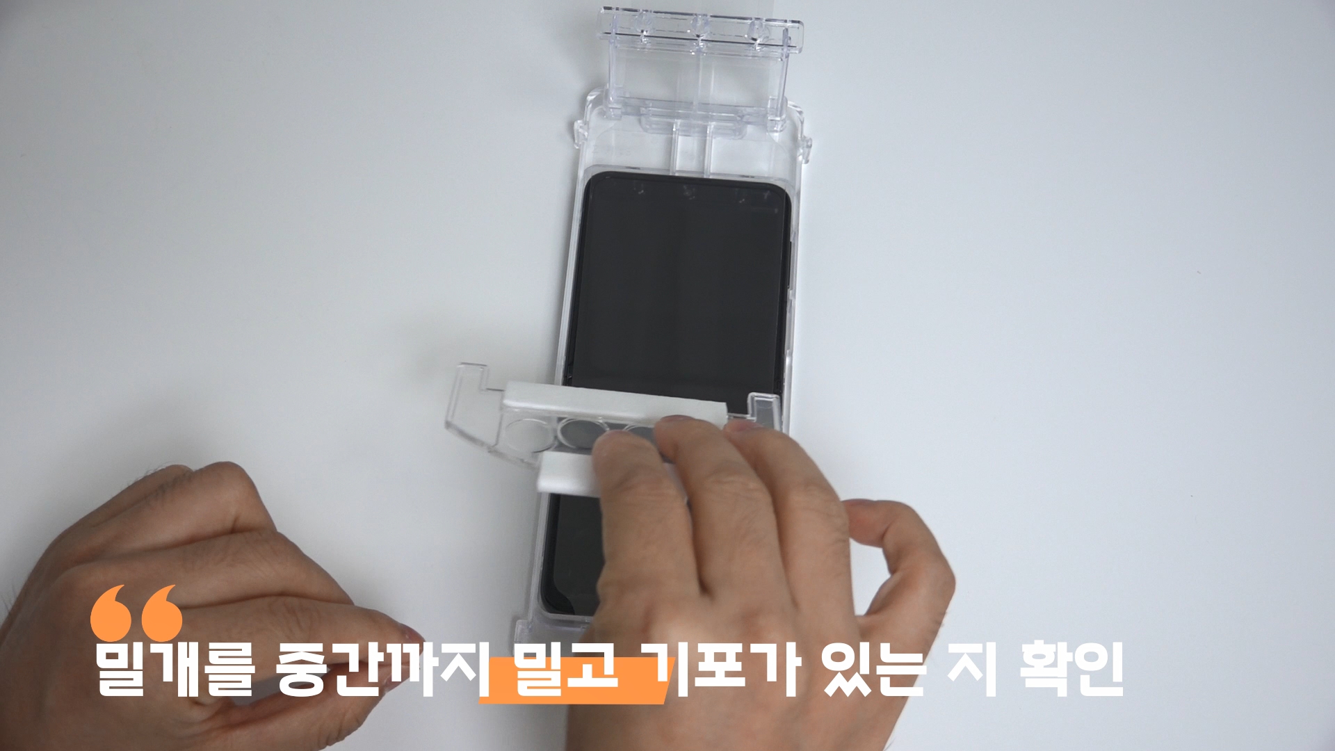 상당히 팽팽해졌는데요. 비스듬한 각도로 밀개를 밀어 줍니다. 밀개는 일정한 힘으로 밀고 중간쯤에서 기포가 있는 지 확인합니다.