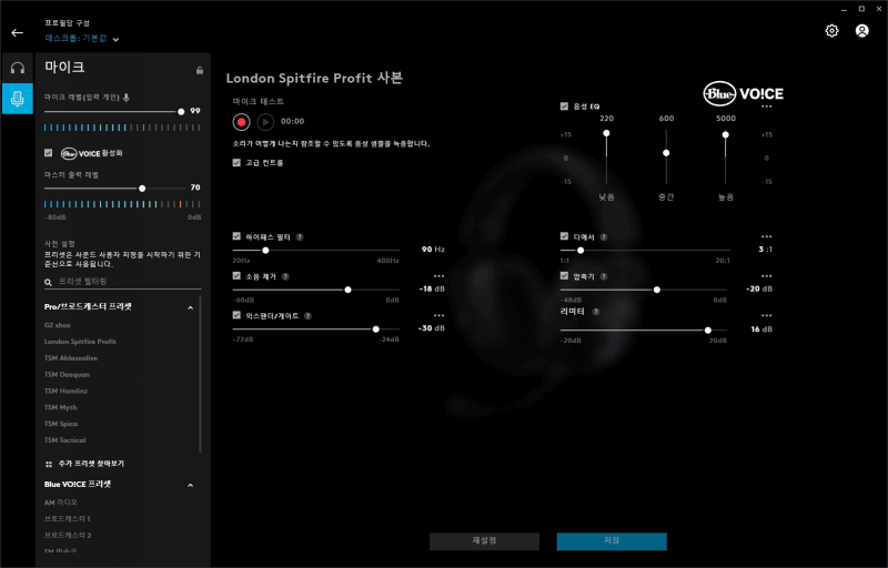 로지텍 게이밍 헤드셋 G PRO X 를 효과적으로 사용하기 위해 로지텍 G HUB 프로그램을 설치하여 줍니다. 장치 인식 후 설정에 보면, E스포츠 PRO 프리셋으로 G2 shox, London Spitfire Profit, TSM Bjergsen, TSM Hamlinz, TSM Myth 등을 선택할 수 있게 되어 있는데요. 프로가 튜닝한 5밴드 EQ 프로파일을 선택해 더욱 실감나는 게이밍 음향을 즐길 수 있습니다.