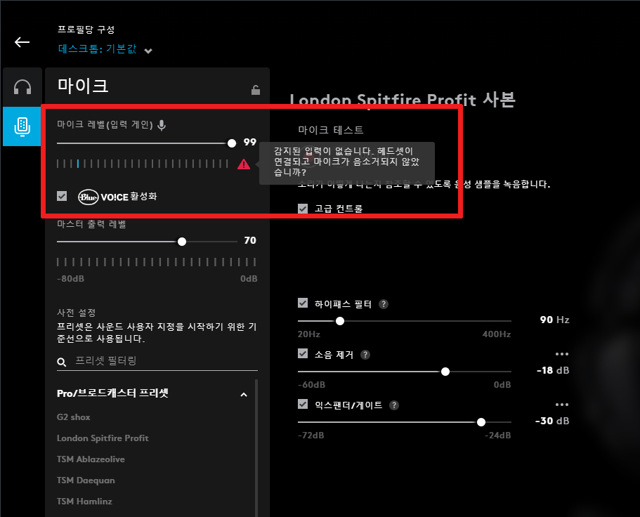그런데 게이밍 헤드셋을 사용하다 보면 마이크가 안되거나 헤드셋의 소리가 안 들리는 경우가 발생합니다. 친절하게 로지텍 G HUB에서는 마이크 세팅이 잘못되었을 때 위와 같이 알려주는데요.