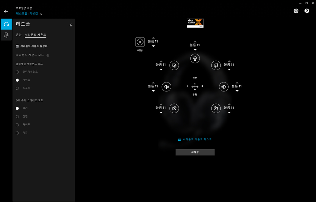 로지텍 G HUB에서 서라운드 설정과 각 채널의 볼륨을 조절할 수 있어 나에게 맞는 오디오를 즐길 수 있습니다.