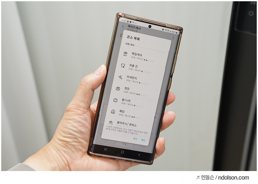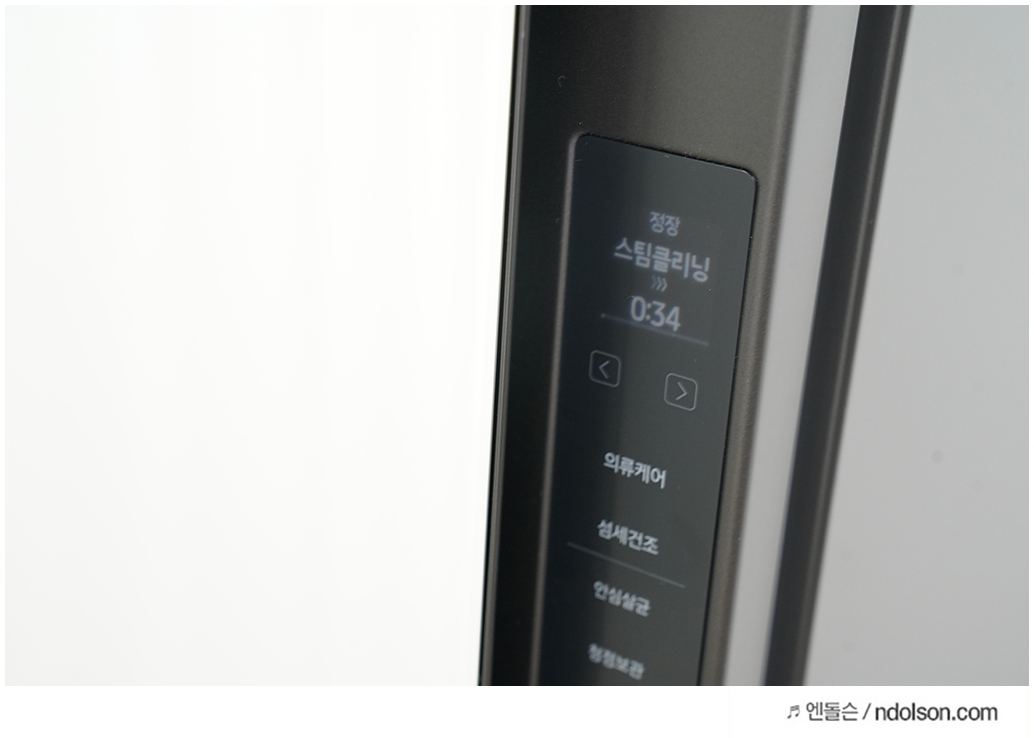 삼성 스타일러에서 버튼으로도 조작 가능하고 스마트폰에서 관리가 가능해요. 최신 가전제품은 모두 인터넷이 되기 때문에 IoT 기능으로 쉽게 앱에서 관리되는데요. 코스를 선택해서 누르면 삼성 에어 드레서로 전송이 됩니다. 정장 선택하고 스팀클리닝을 시작했어요. 34분 정도 걸려요.