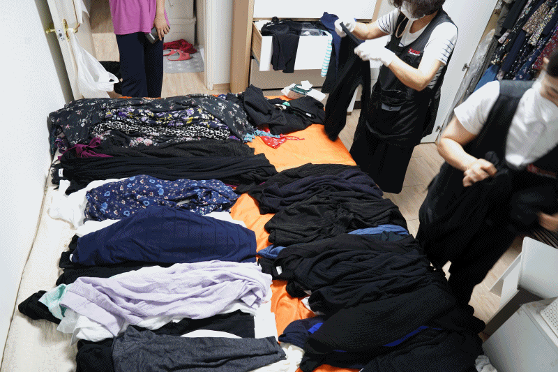 옷을 다 꺼내서 종류별로 정리가 들어갔어요. 두 분이 손도 빠르시고 옷 정리 노하우도 알려주시더라고요. 또 3년 내내 꺼내보지 않았던 옷도 나와서 민망했는데요. 이런 게 우리가 짐처럼 짊어지고 사는 불필요한 옷인가 봐요.