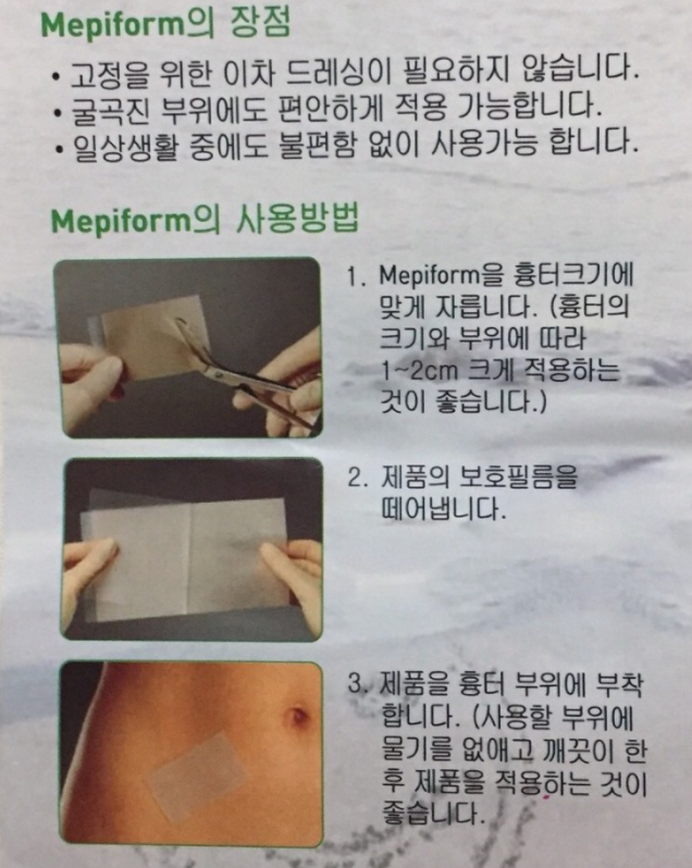 와이프의 흉터치료 연고로 구매하게 된 메피폼 후기입니다. 편의점에서 선반에 찍혀 보험처리하고 정말 고생했네요. 상처가나서 결국 흉져서 병원치료 받고 메피폼은 직구하여 바르고 보험 청구하기로 하였습니다.