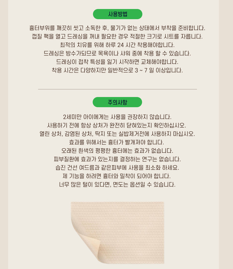 흉터관리 초기에 사용하면 아주 좋습니다. 흉터가 넓어서 옷등에 쓸려 부위가 다칠 수 있기 때문에 붙여주어야 합니다.