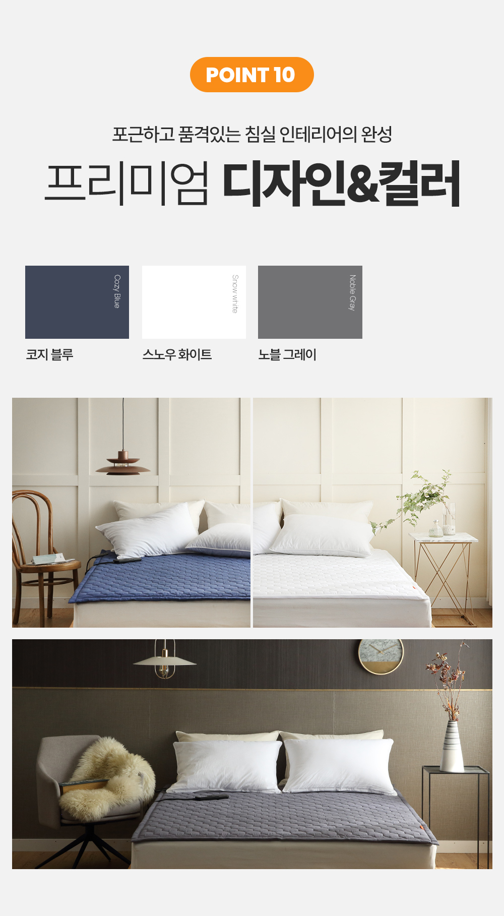 침대위에서 쓰기 때문에 색상도 중요한데요. 코지 블루, 스노우 화이트, 노블 그레이 3가지 색상인데요. 코지 블루는 진한 남색 느낌인데 심플하고 좋아요. 화이트는 안써봤고 노블 그레이는 밝은 그레이라 칙칙하지 않고 질리지 않은 색상이에요.