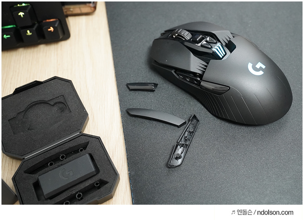 필자는 젓가락질은 왼손으로 하는 왼손잡이인데요. 로지텍 G903 HERO는 양손잡이마우스로 사이드 버튼의 커버를 어떻게 배치하냐에 따라 오른손/왼손 마우스가 될 수 있습니다. 10g 마우스 무게추도 있어 자신에게 맞게 커스텀마이징도 가능합니다.