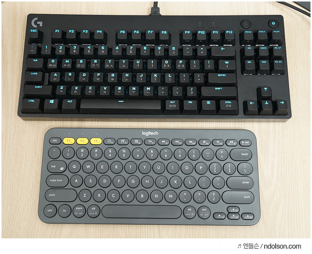 타건감이 훌륭한 로지텍 G PRO 키보드는 게이밍을 즐길 때 키를 누르는 반발력에 누르는 재미도 크고, 빠르게 캐릭터의 스킬을 컨트롤할 때 게이밍 마우스가 좋습니다. 반면 블루투스의 무선에 간편한 휴대성의 갖춘 로지텍 K380은 그런 재미가 덜하죠.