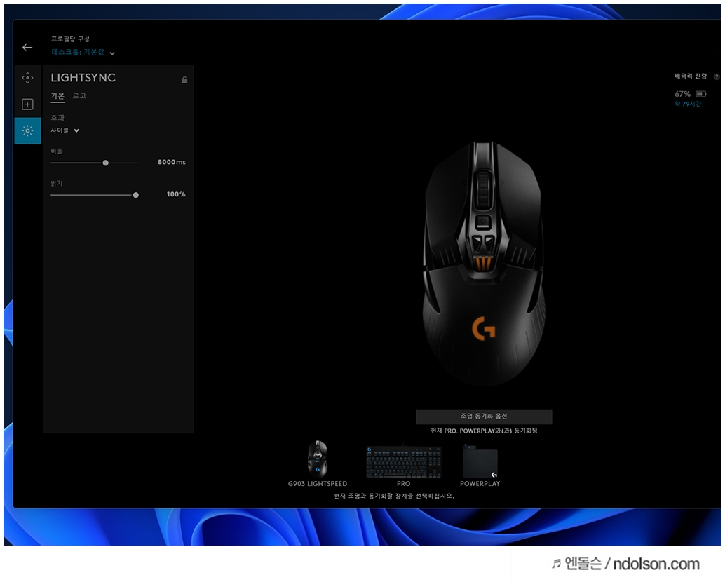 POWERPLAY 마우스 무선충전 패드와 G PRO기계식키보드, 로지텍 G903 HERO 까지 모두 동기화 설정을 해두면 RGB색상을 깔맞춤 할 수 있습니다.