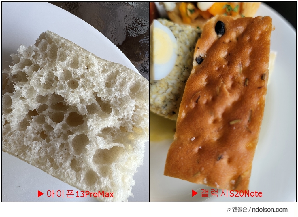 아이폰13과 갤럭시노트20울트라를 비교해보면, 접사에서 차이가 납니다. 갤럭시는 가까이서 촬영해서 화질이 나빠졌습니다. 만약 조금 멀리서 확대하면 화질이 더 좋았을 겁니다.