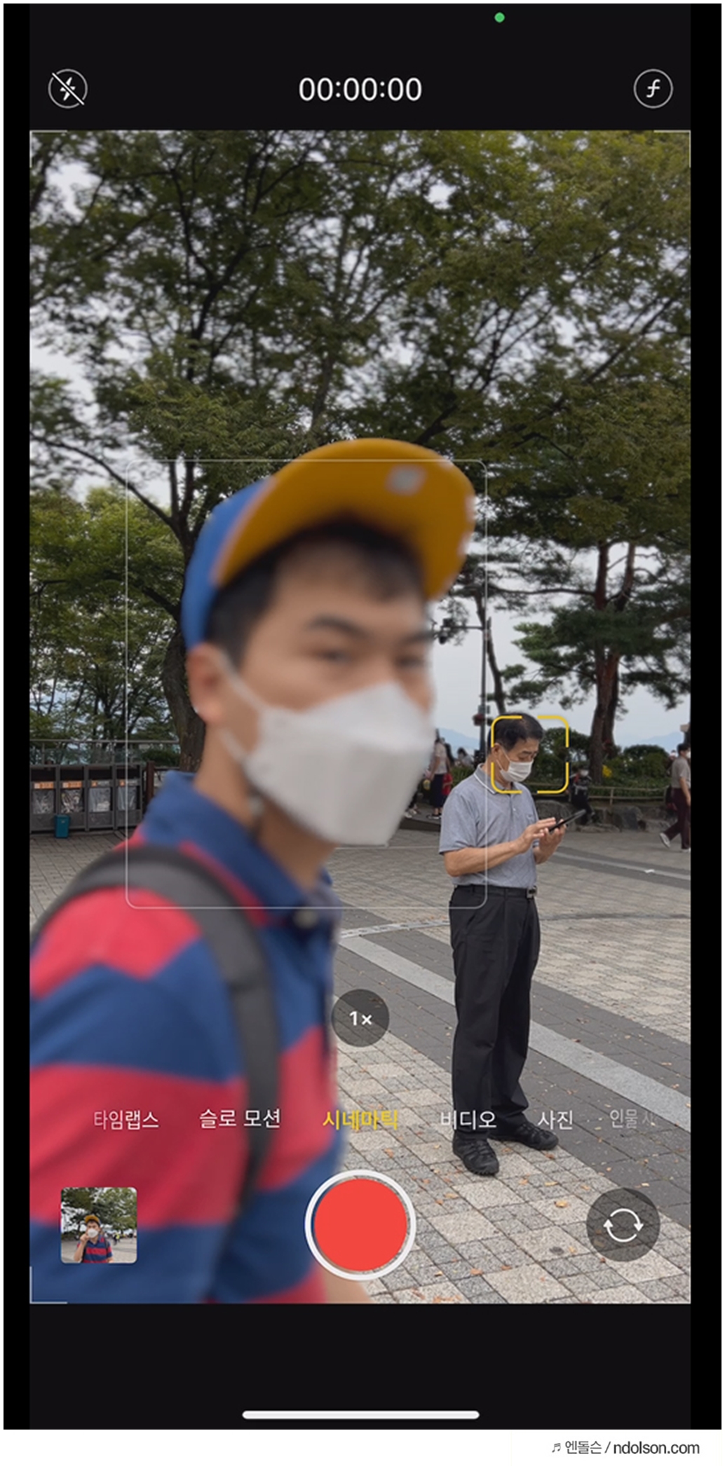 아이폰13 앵글에 들어온 사람을 빼고는 아웃포커싱이 되어 자연스러운 보케 느낌이 됩니다. 또 앵글에 있는 피사체에 네모의 초점모드가 적용됩니다.