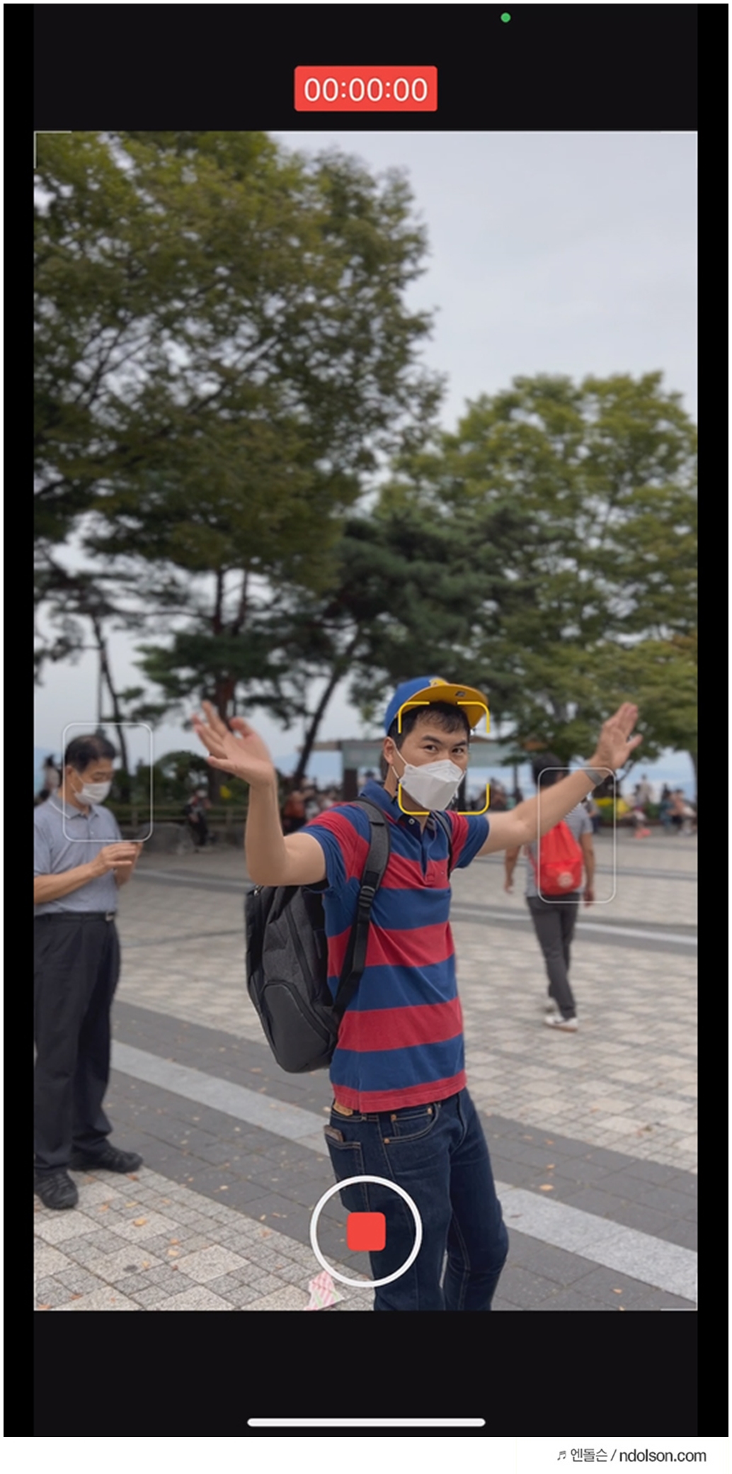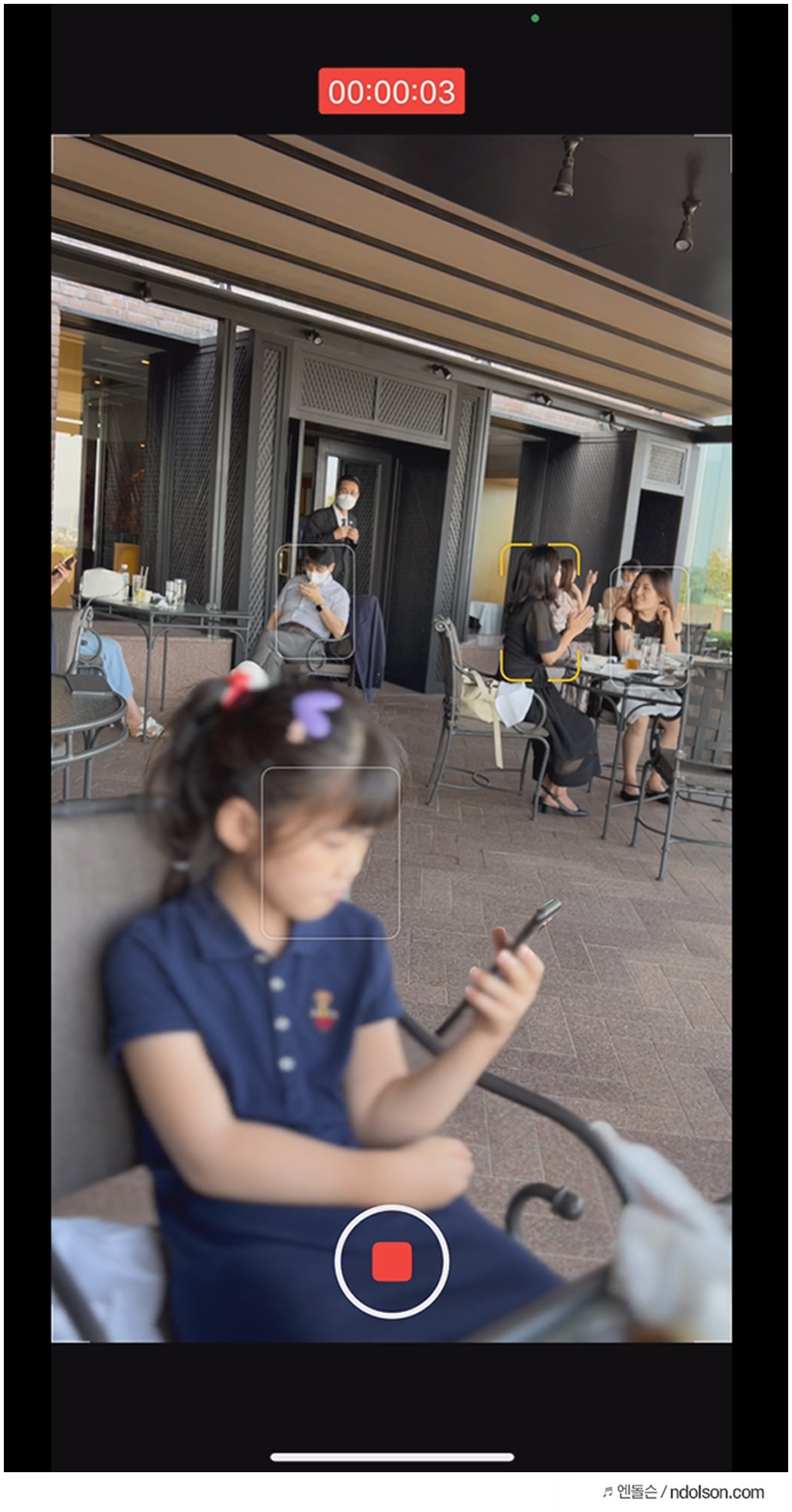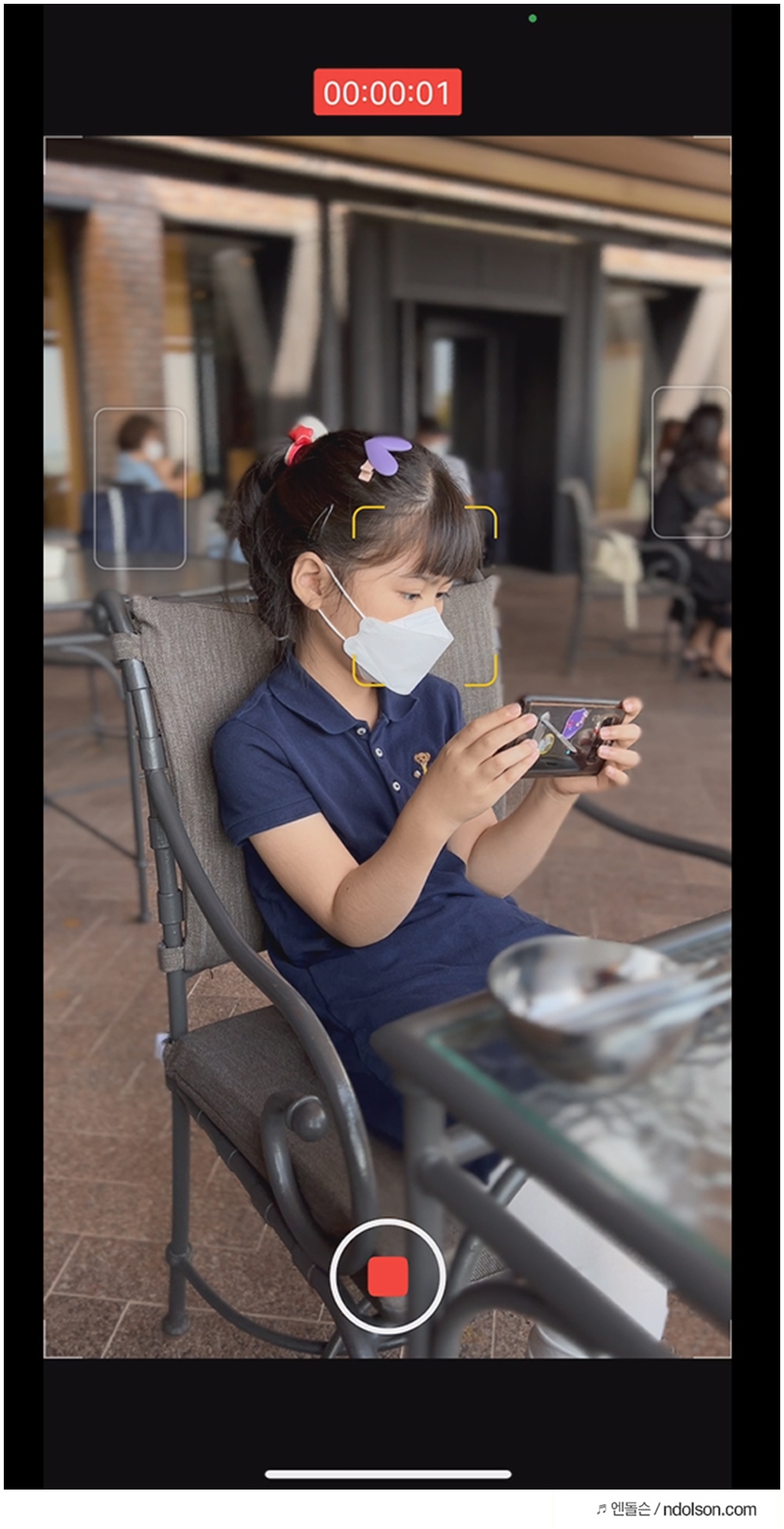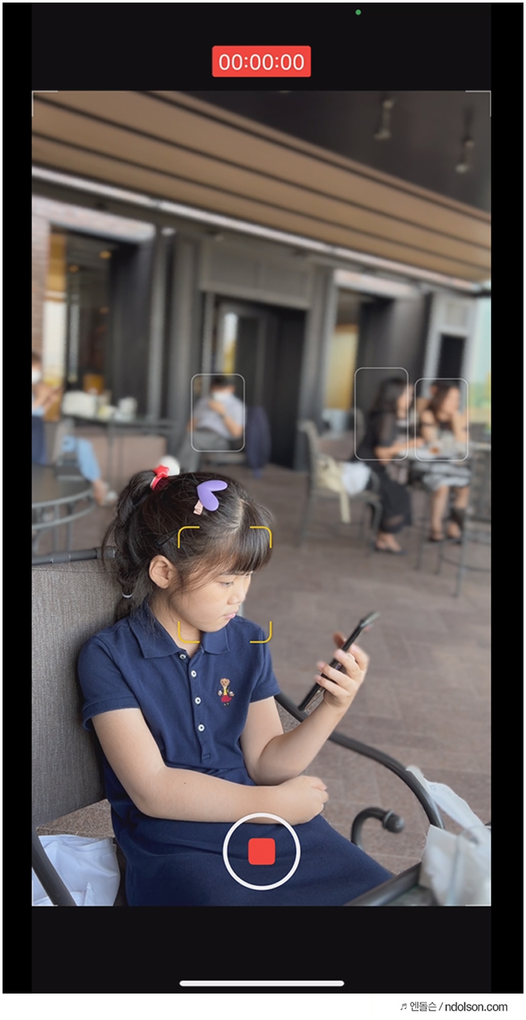 아쉽지만 뒤에 사람이 정면을 쳐다본다고 자연스럽게 포커스가 정해지지는 않습니다. 손으로 콕 찍어주어야 하죠. 또 이렇게 촬영된 영상은 갤러리에서 후편집으로 초점을 변경할 수 있어 놀랍습니다. 이건 그냥 고가의 촬영 장비네요.