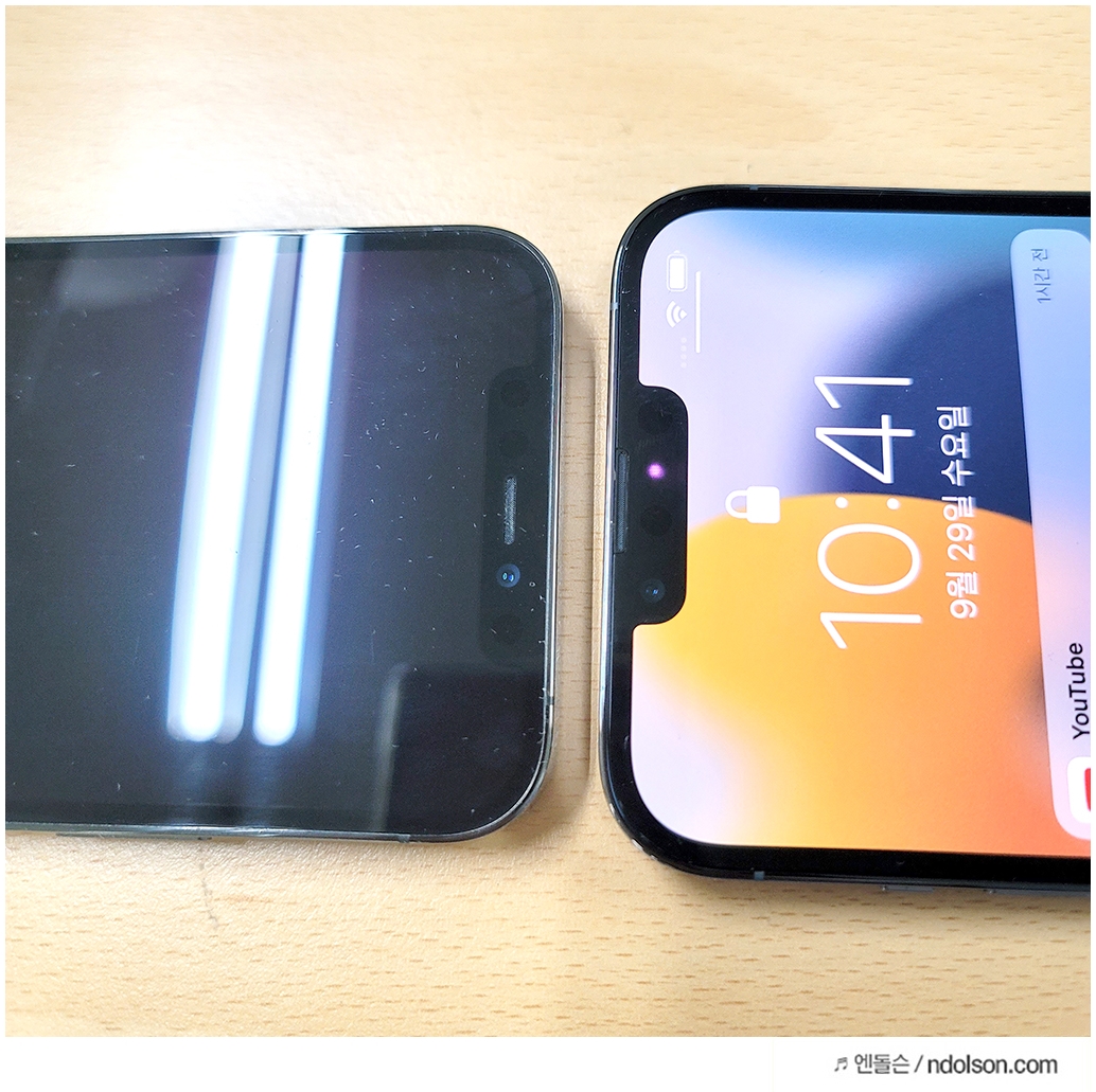 아이폰12와 아이폰13의 전면의 노치도 크기 차이가 있습니다. 20% 더 줄어든 노치가 줄어 들었고 수화부가 상단으로 올라갔습니다.