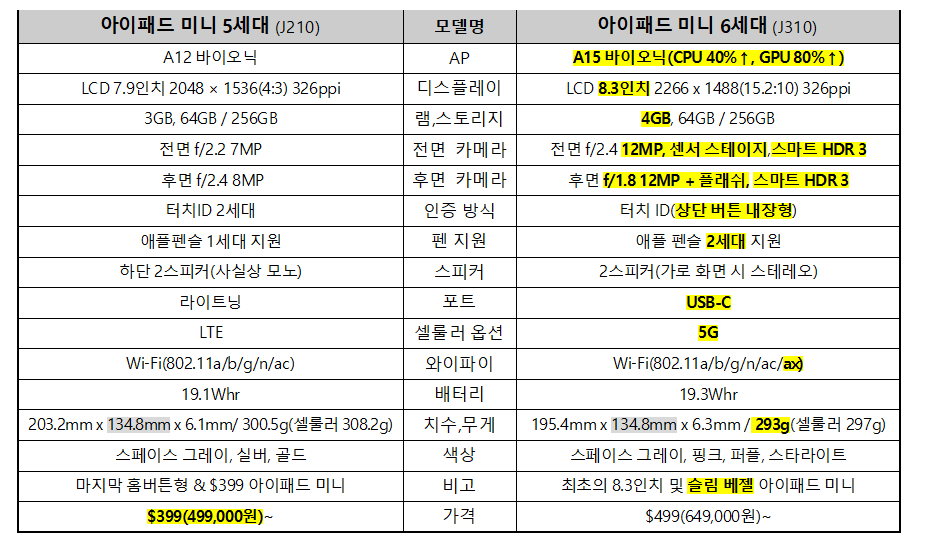 또 LTE에서 5G를 지원하는 최초의 아이패드 미니가 되었스니다. 그외에 전체 무게는 더 줄어 293g 이 되었습니다.