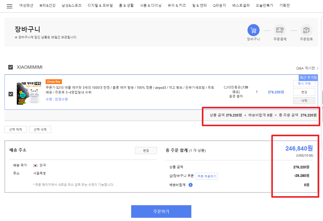 국내 애플 공홈 가격보다 저렴하게 구매할 수 있습니다. 할인 쿠폰을 적용하면 246,840원에 구매할 수 있습니다. 가격적인 매력과 빠른 3~4일 배송이고, 관부세가 포함된 가격입니다.