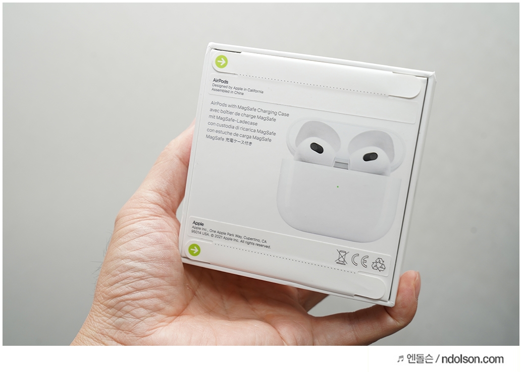 이번에도 애플은 친환경정책으로 비닐포장을 없애버렸습니다. 아이폰13에서 비닐 포장을 없애 플라스틱 사용을 600톤 절감했다고 한다. 라벨을 벗기는 스티커형으로 포장되어 있고 별다는 에어팟 3세대 언박싱할 것은 없습니다.