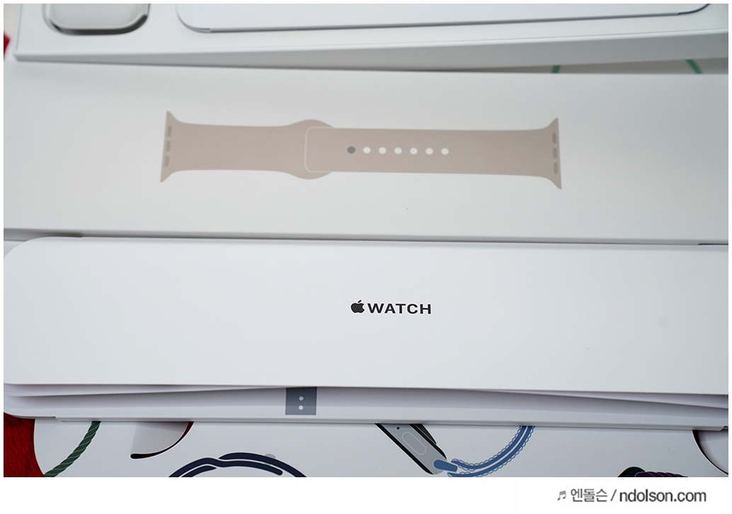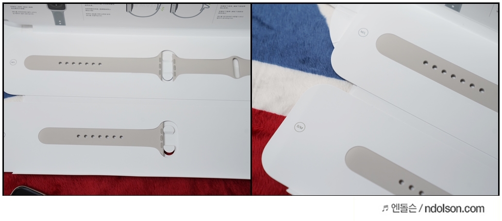 애플워치7 밴드는 스포츠 밴드로 스타라이트 색상으로 매칭 하였습니다. 가장 기본이고 자주 쓸거 같은데요. S, L 사이즈와 줄길이가 다른 밴드가 2개 있습니다.