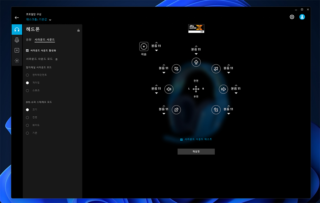 7.1채널이라 서라운드 사운드로 입체적인 음향을 즐길 수 있습니다. 멀티채널 사운드 모드를 게이밍으로 해두면 게임할 때 더욱 멋지게 즐길 수 있죠. 또 DTS Headphone:X 2.0 7.1 서라운드로 감상할 수 있게 옵션 기능을 켤 수 있습니다.