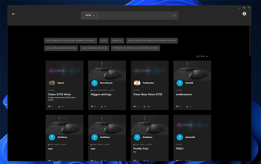 로지텍 G HUB 프로그램은 로지텍 키보드/마우스/헤드셋 등의 게이밍기어를 관리할 수 있는 프로그램인데요. 세부 설정을 할 수 있는데, "G733" 으로 검색하면 프리셋을 추가로 더 받을 수 있습니다. Clear Bass Voice G733 등의 설정값을 다운로드해서 내 게이밍기어에 설정해볼 수 있는 것이죠.