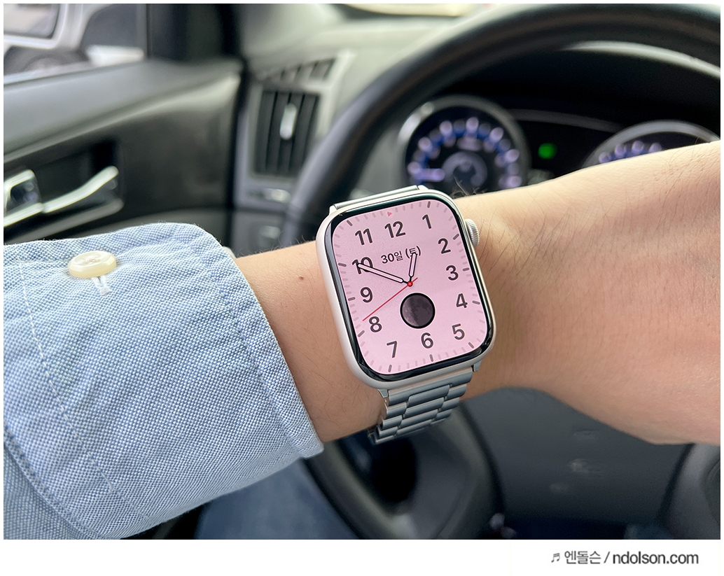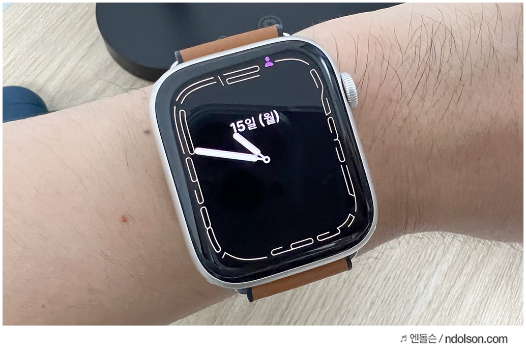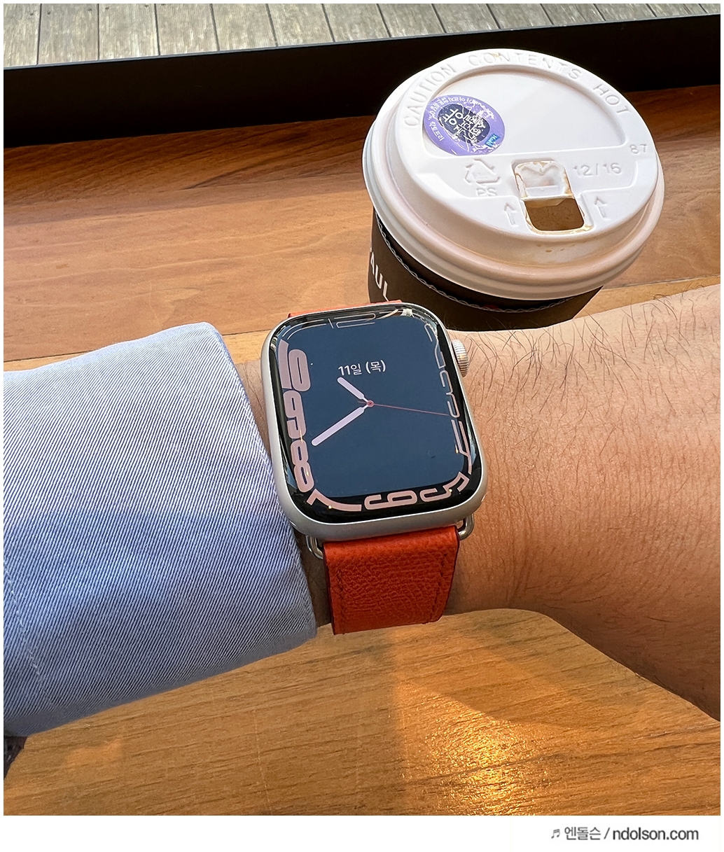 애플워치 7세대는 41mm, 45mm 두 가지의 크기로 출시되는 데, 필자는 큰 시계가 마음에 들어 45mm로 선택하였습니다. 스트랩과 애플워치 시계페이스에 따라 분위기가 매번 달라 착용하는 재미가 큽니다. 하지만 덜렁거리는 성격에 애플워치 액정 파손 비용이 새로 사는 가격만큼 비싸기 때문에 꼭 대비를 해야 할 것 같더군요.