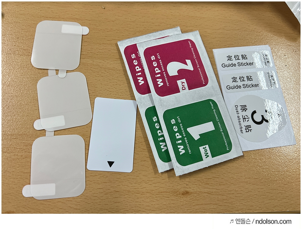 애플워치 액정보호필름의 구성품은 이물질 제거 티슈/물기제거, 먼지제거, 보호필름, 밀개가 있습니다.