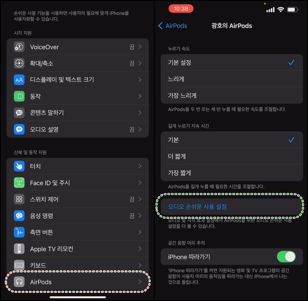 에어팟 오디오 튜닝을 하기 위해서는 아이폰의 설정에서 설정 > 쉬운사용 > AirPods > 오디오 쉬운 사용 설정을 해야 합니다.
