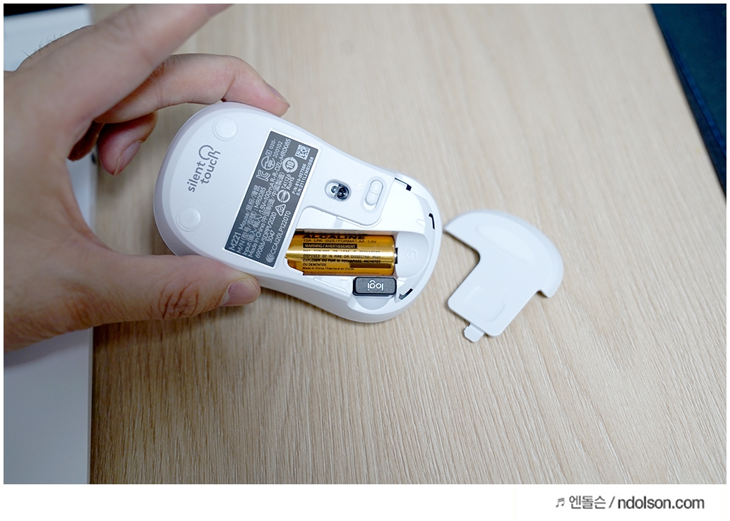 하단에는 전원 ON/OFF 스위치가 직관적으로 있습니다. 배터리는 AA 건전지 1개로 최대 18개월을 사용할 수 있는 긴 배터리 시간을 가지고 있습니다. 또 하단부에 USB 무선 수신기 보관 공간이 있어 수납도 가능합니다.