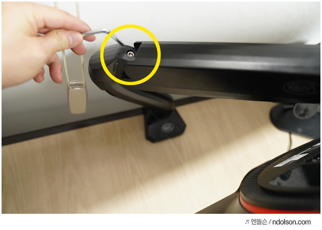 모니터 암의 고정력을 조절하는 부분이 위의 노란색 부분인데, +(더하기) 쪽으로 돌려 줍니다. 모니터 암이 이제 힘을 받아 원하는 방향으로 잘고정 됩니다.