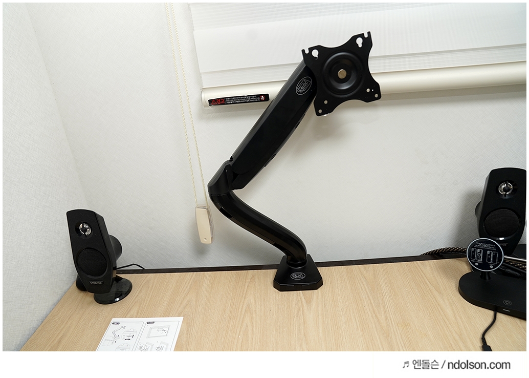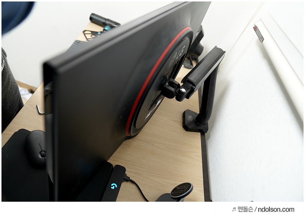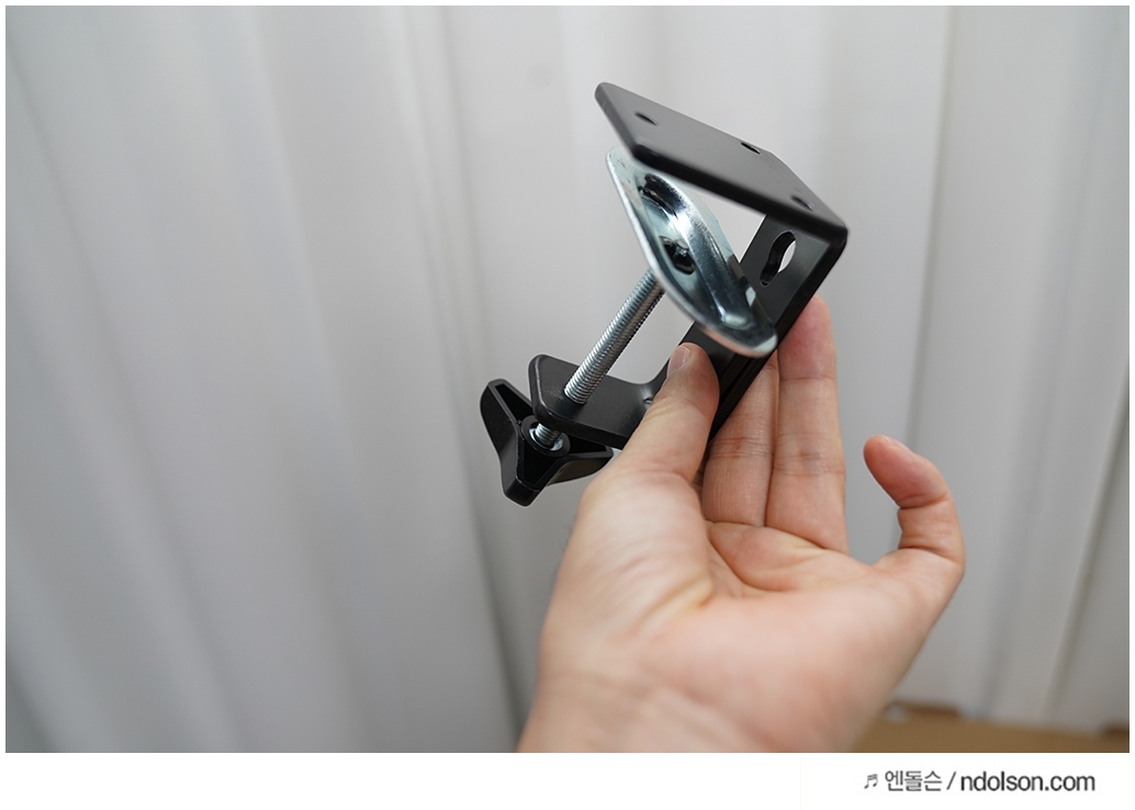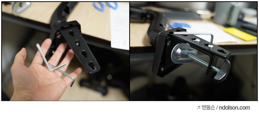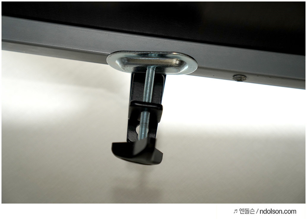 책상과 맞을까? 가장 걱정되었는데, 책상에 구멍이 있는 타입이나 옆에 걸어서 고정시키는 2가지 타입을 모두 지원하는 악세서리를 줍니다. 그래서 문제는 없습니다.