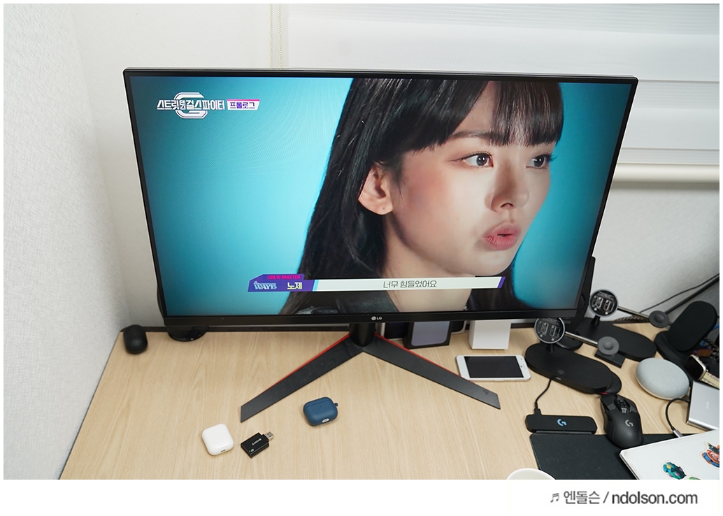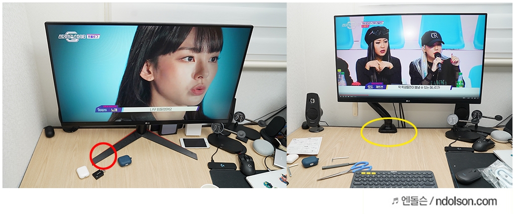 모니터 암 거치대를 쓰냐 않쓰냐의 차이는 왼쪽: 기본 모니터거치대, 오른쪽: 모니터암 사용시 공간 활용은 차이를 알 수 있습니다. 필자는 책상에 리뷰 제품을 두고 촬영을 하다보니 모니터를 치우는 일이 너무 불편해서 더욱 그렇게 느끼게 되었습니다.