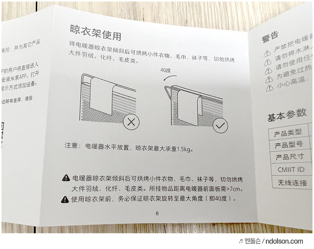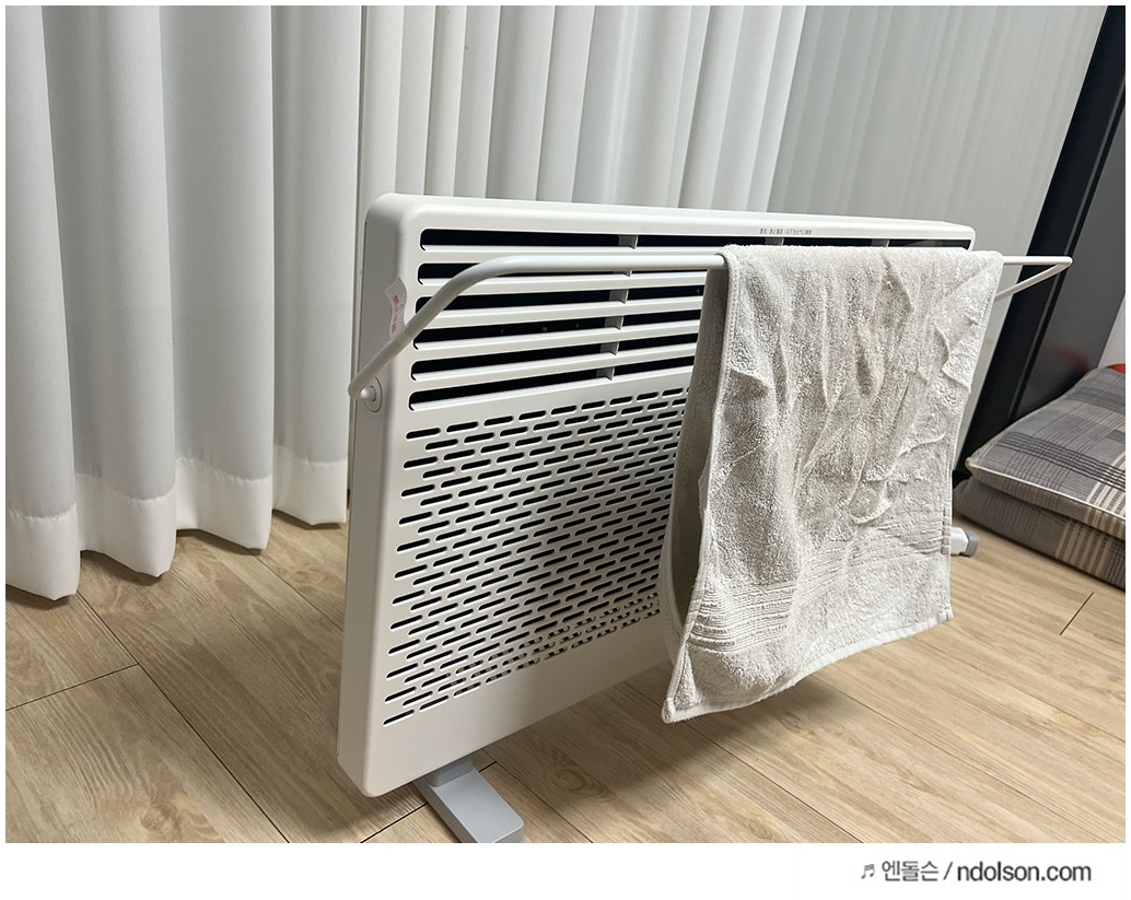 샤오미 전기난로 그래픽 스마트버전은 자연대류 방식으로 건조하지 않습니다. 또 위의 사진처럼 수건 걸이가 있어 각도 조절을 해두고 건조시켜볼 수 있어 좋습니다.
