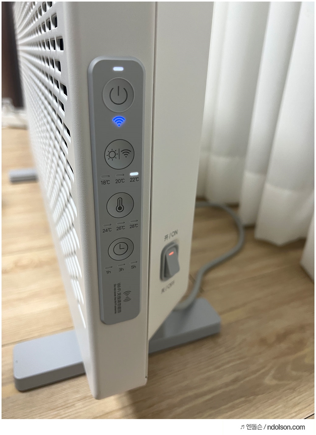 샤오미 전기난로 측면에는 전원 ON/OFF 물리적 스위치와 터치식 조작 버튼인 전원 ON/OFF, 온도 조절, 시간 설정이 있습니다.