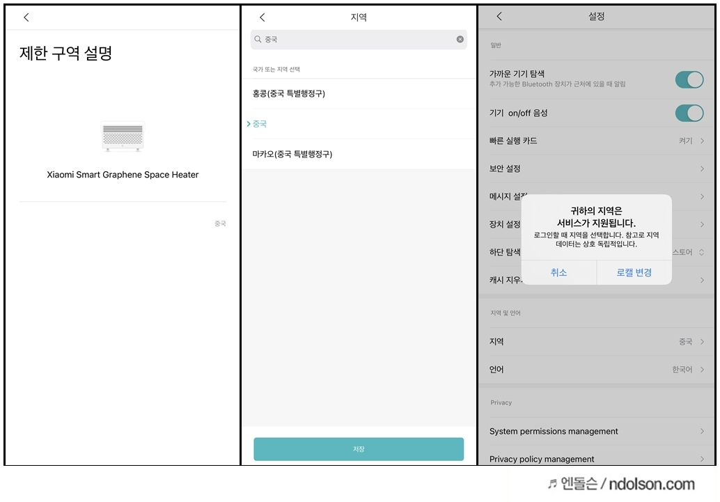 등록시 아직은 샤오미 미지안 그래핀 스마트 라디에이터가 중국에서만 허용되기 때문에 미홈 설정에서 지역을 중국으로 바꾸고 찾아야지만 스캔이 가능합니다.