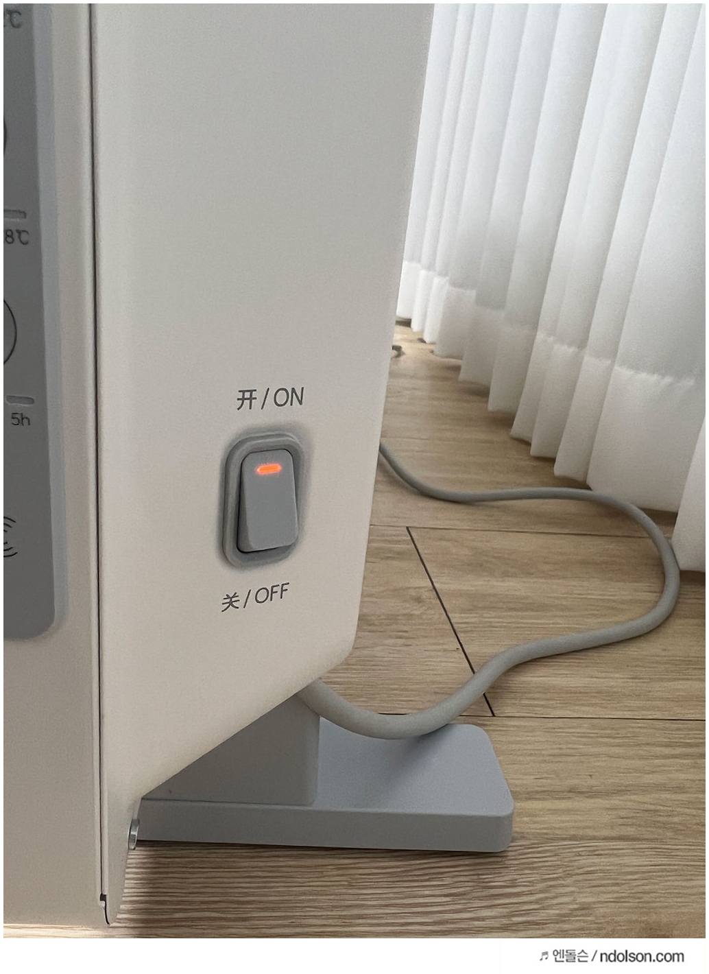 하지만 샤오미 미지아 전기난로 5세대 단점은 이렇게 켜진 상태에서도 전면에 빨강색 열선이 보이거나 하지 않아서 켜진건지 꺼진건지는 알기 쉽지 않네요. 측면을 보면, 전원버튼에 표시가 나와 알 수는 있습니다.