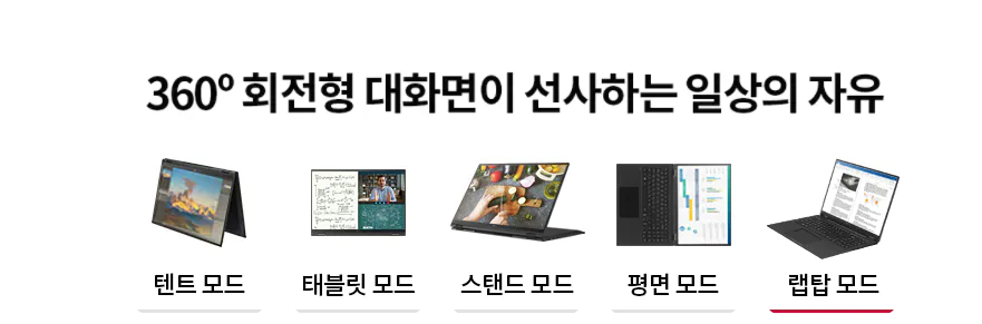 LG 그램 360은 360도 회전이 가능한 힌지를 가지고 있어 노트북, 태블릿, 텐트, 스탠드 모드로 사용할 수 있습니다. 정말 형태에 따라 활용할 수 있는 방법이 다양해서 좋습니다.