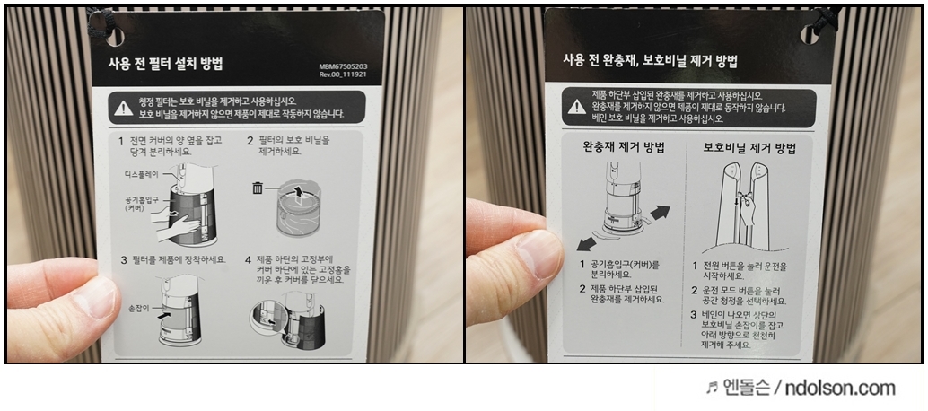 LG전자의 프리미엄 제품으로 스크래치와 충격을 방지한 꼼꼼한 포장을 볼 수 있습니다. 사용 전에 필터 비닐 제거와 완충재를 제거 후 사용할 수 있습니다.