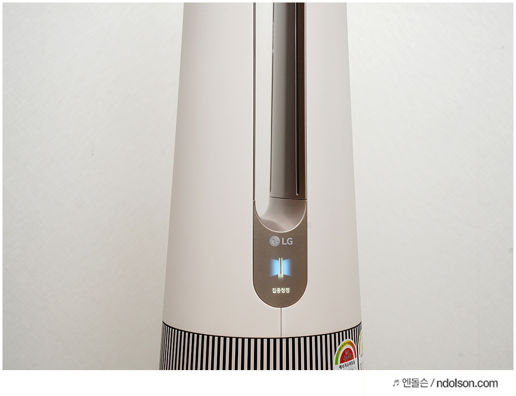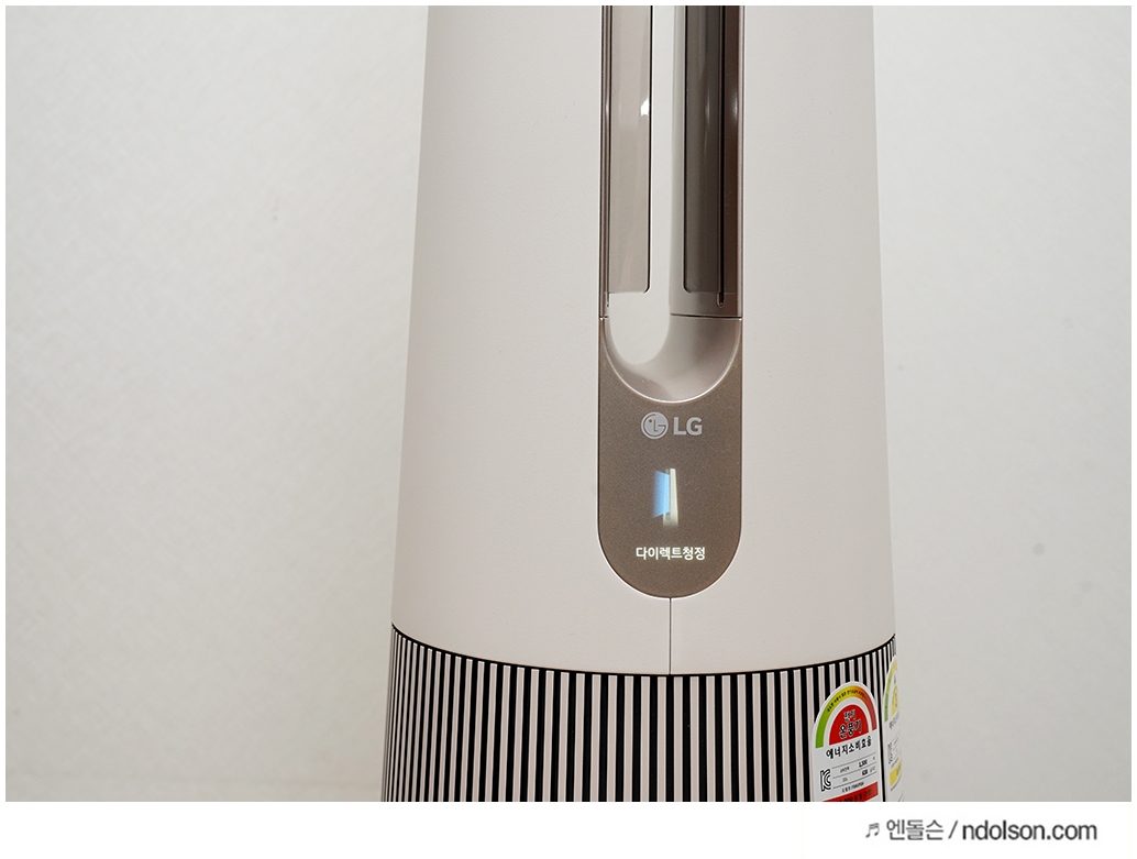 리모컨도 제공되지만, 에어로타워 상단부에 터치로 조작할 수 있습니다. 본체 터치버튼이 상단에 있어 조작이 더 편하네요. 또 LG Thinq 앱 연동으로 쉽게 IoT 제품 제어가 되어 시간 예약이나 운전 모드를 집중 청정, 공간청정, 다이렉트청정으로 바꾸어 볼 수 있었습니다.