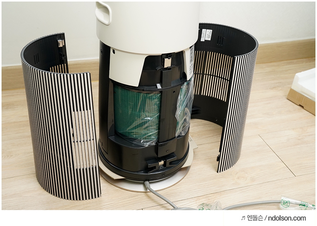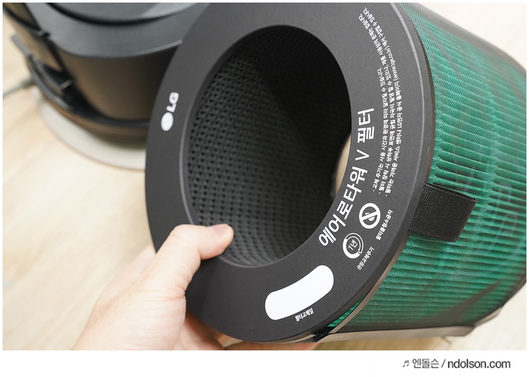에어로타워 V필터는 에어로타워의 공기읍입구 전면 커버를 양쪽으로 잡아당겨 분리한 다음 필터의 보호필름을 제거해줍니다. 단순히 선풍기처럼 바람만 나오는 게 아니라 공기청정팬으로 필터가 있어 오염된 미세먼지를 걸러 줍니다.