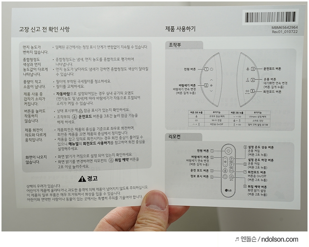 리모컨을 쓰다 보면, 어디로 갔지? 항상 찾게 되는데요. LG 에어로타워는 자석 타입으로 옆에 리모컨을 부착할 수 있어 상당히 편리했습니다.