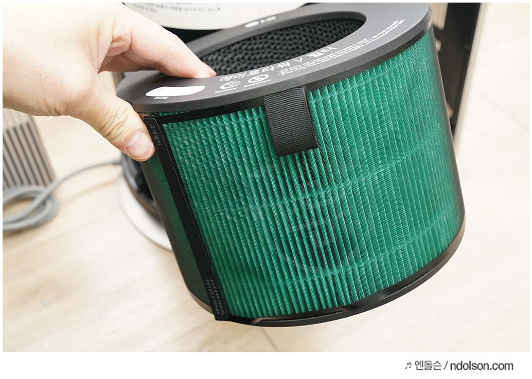 에어로타워 V필터는 에어로타워의 공기읍입구 전면 커버를 양쪽으로 잡아당겨 분리한 다음 필터의 보호필름을 제거해줍니다. 단순히 선풍기처럼 바람만 나오는 게 아니라 공기청정팬으로 필터가 있어 오염된 미세먼지를 걸러 줍니다.