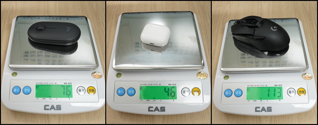 어느 정도의 무게인지 가늠이 안되니 비교해보면, 로지텍 퍼플이 휴대용으로 가볍다고 생각했는데, 76g이며, G903은 113g입니다. 에어팟3세대가 46g인걸 보면, 로지텍G PRO X 슈퍼라이트가 얼마나 가벼운 마우스인지 아시겠죠?