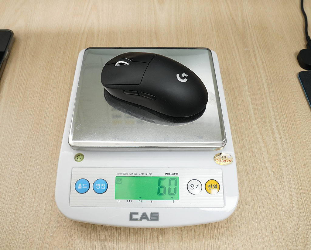 정말 가벼운 마우스 무게 한번 체크해보겠습니다. 스펙상 63g의 울트라 초경량 설계인 로지텍 G PRO X 슈퍼라이트는 실제로 재어보니 USB 수신기가 빠져서 60g으로 측정되었습니다. 실제 조작 시의 무게겠죠?