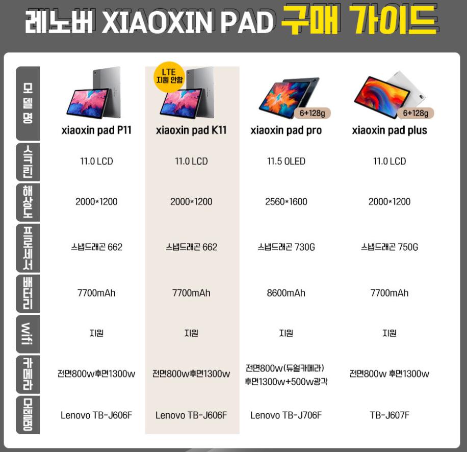 레노버 샤오신패드 P11/K11/PLUS/PRO 스펙 비교