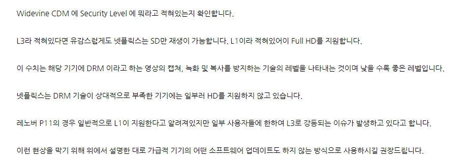레노버 업데이트를 하면 넷플릭스 L1이 지원하지 않아 L3로 강등되는 이슈로 화질이 저하될 수 있을 듯합니다. 참고하셔서 주의하세요.