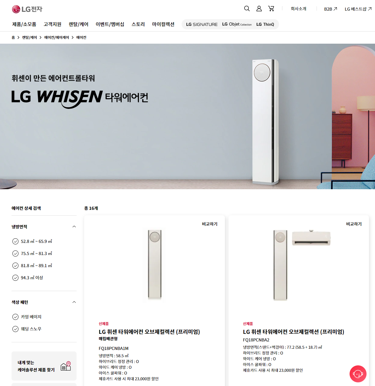 올해 출시된 LG휘센 타워에어컨 오브제컬렉션을 포함해서 다양한 모델이 있습니다. LG전자 가전 중에서 가장 고급스러운 프리미엄인 오브제컬렉션은 기능도 많고 디자인도 멋져서 써보고 싶었는데요. 렌탈로 쉽게 교체할 수 있어 좋네요