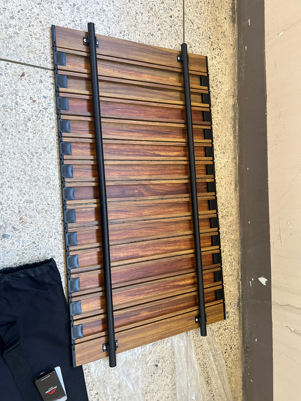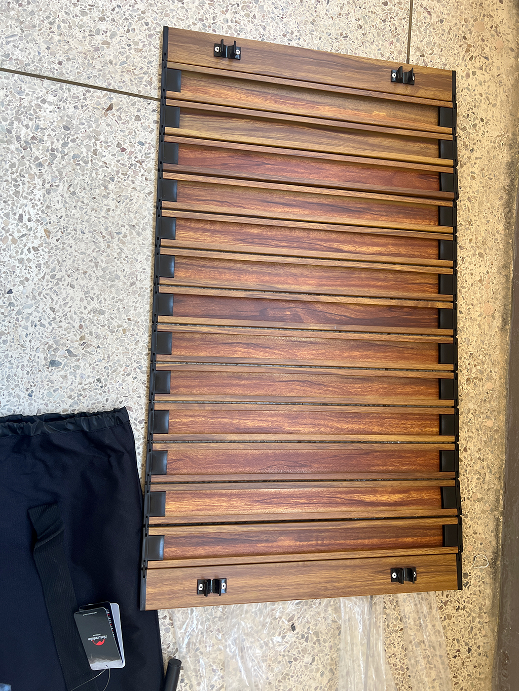 상판은 나무재질이라 이쁩니다. 또 돌돌 말아버릴 수 있어서 짐 싫을때는 상판을 덮지 않습니다.