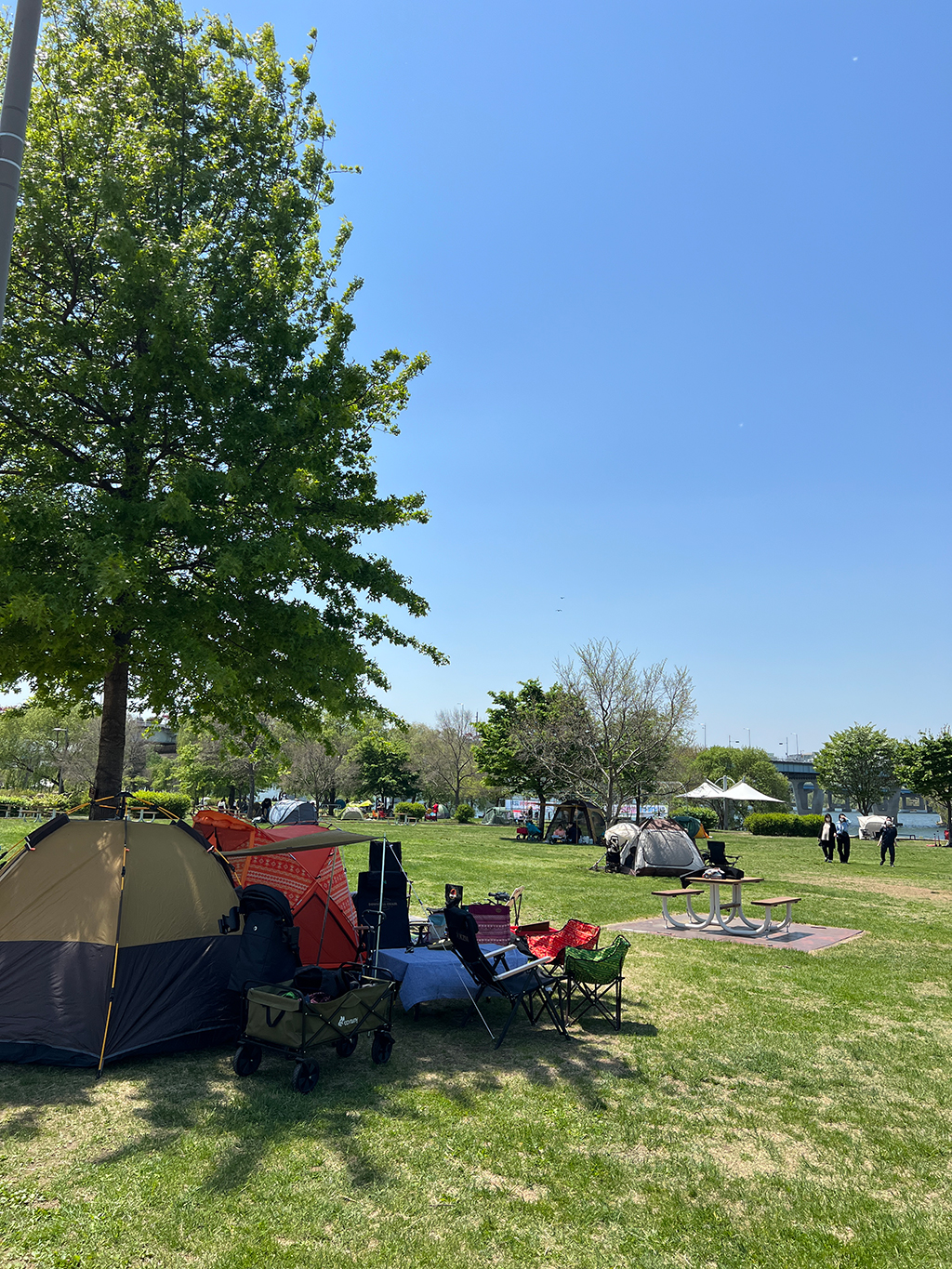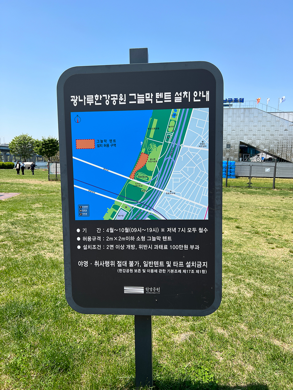 한강에 텐트 펴도 되는 지역과 기간이 있는데요. 4월부터 10월까지 19시전까지 자유롭게 텐트를 쳐도 됩니다. 날씨가 좋아 한강자전거 타러가거나 자유로움을 느끼기 좋은 날씨인데요.