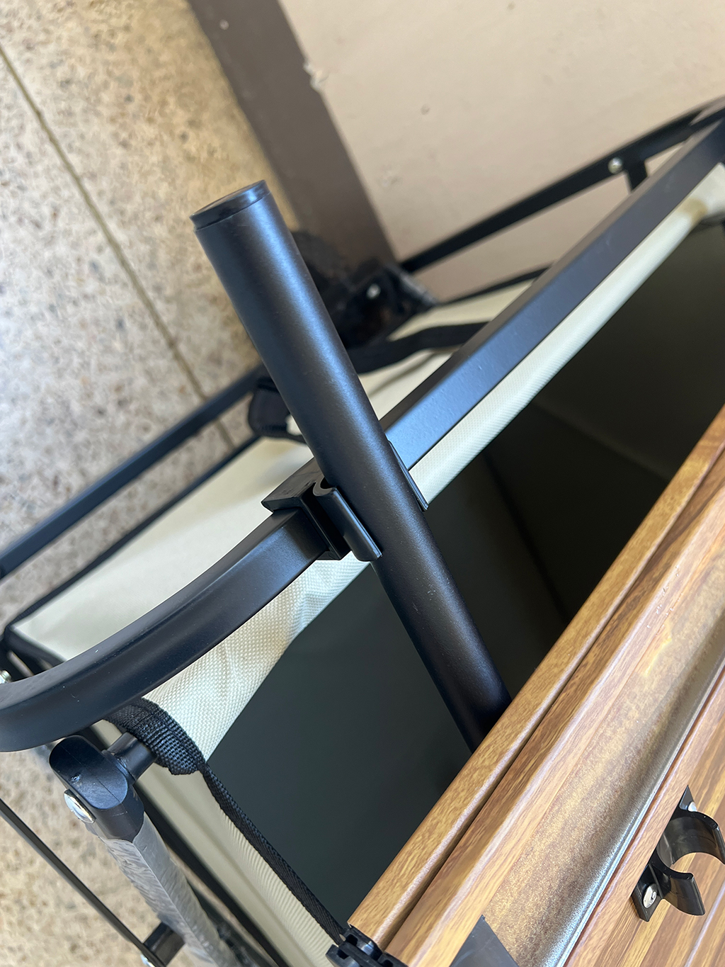 이렇게 웨건 프레임에 집개 모양을 걸고 아까 연결한 긴 봉을 올려주면 상판 완성!