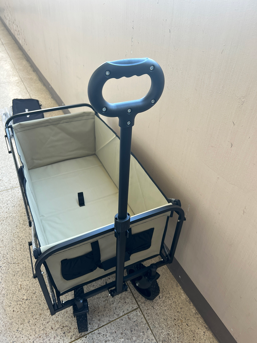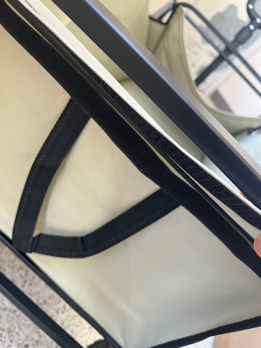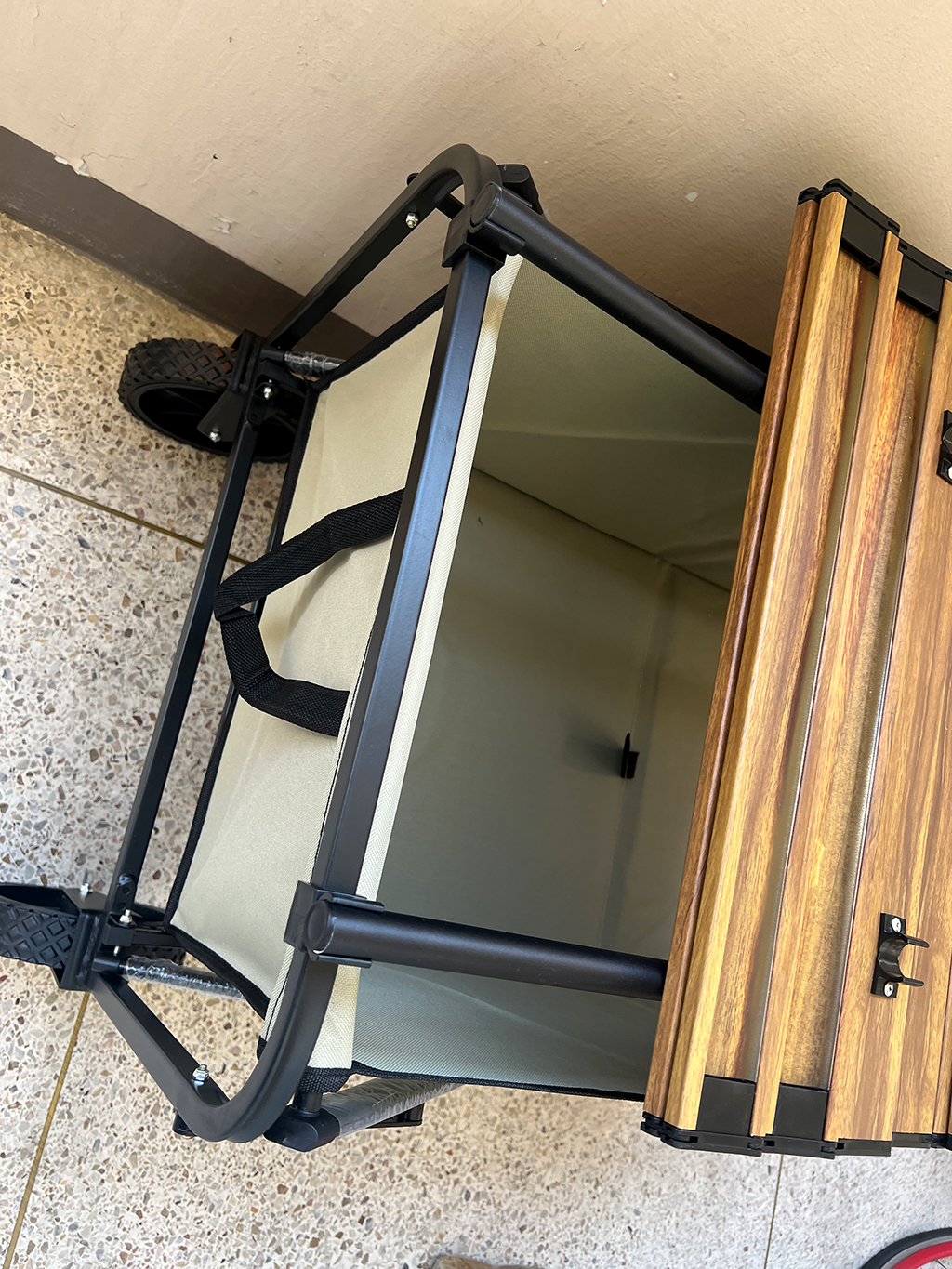 웨건이 접이식이라 공간차지가 적었습니다. 처음 웨건 사용을 위해서 세팅을 해야합니다. 모서리에 천을 걸치고, 찍찍이를 웨건 프레임에 붙여주면 네모란 박스가 됩니다.