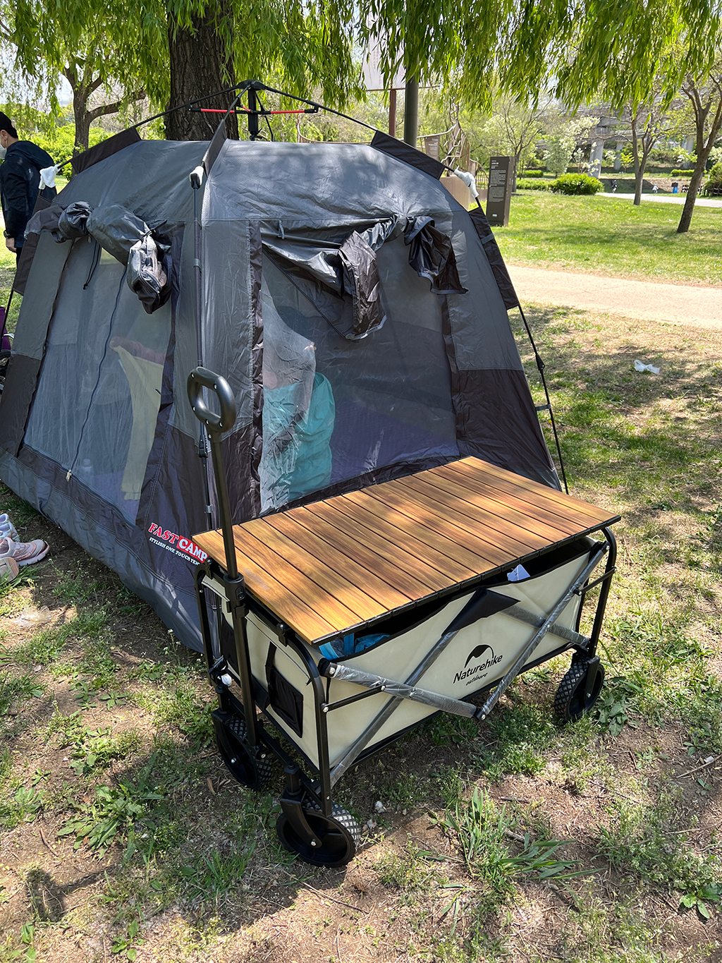한강 광나루에서 텐트를 치고 놀았습니다. 다들 한장비(?)하게 들고 오셨던데, 짐이 많을 때는 웨건이 좋네요. 배달은 제2주차장으로 치킨, 자장면 배달이 되어 한강에서 놀기 좋네요.